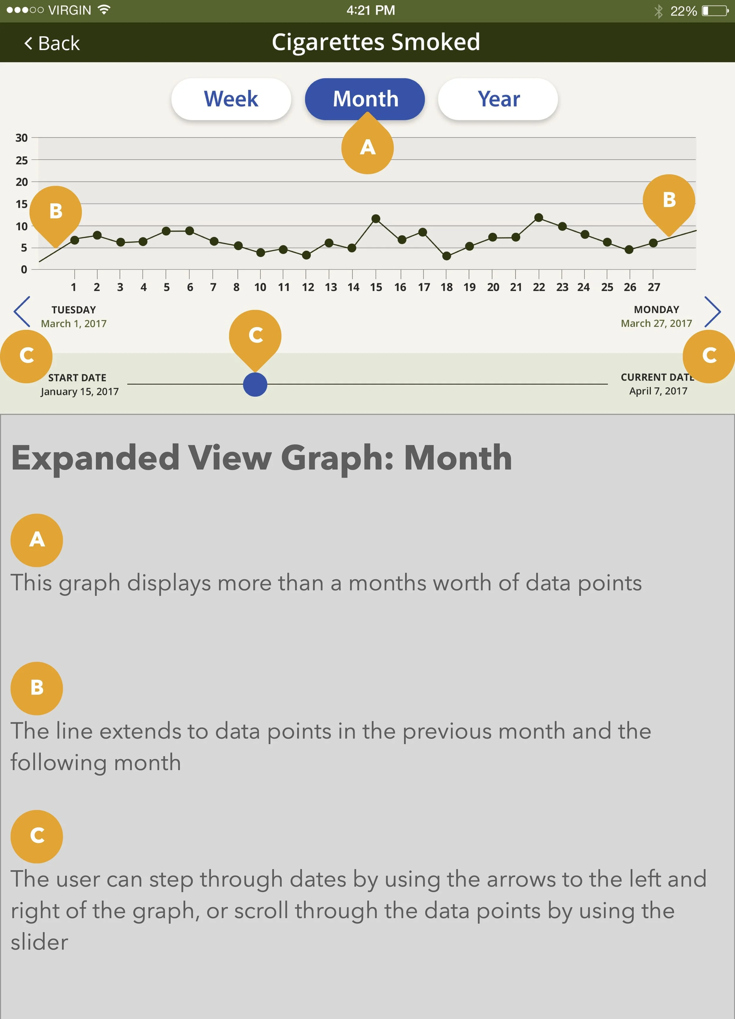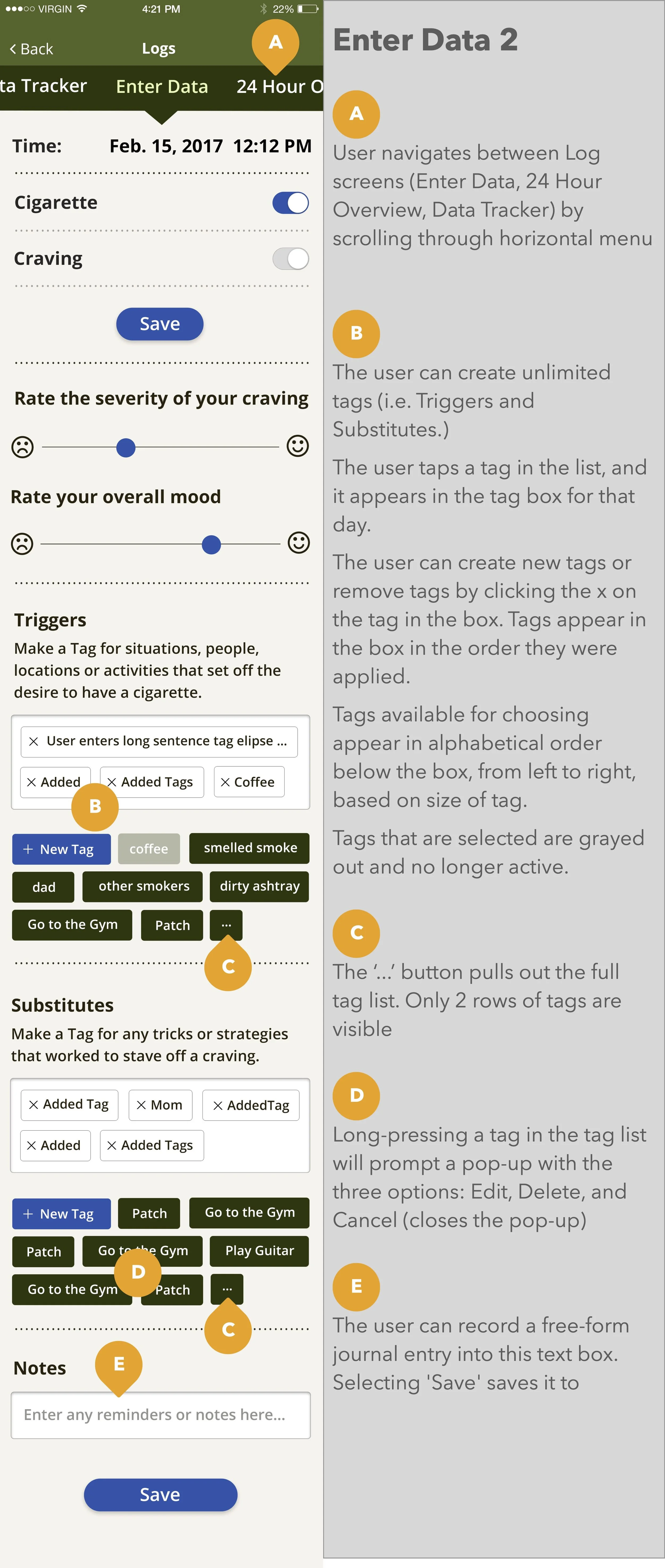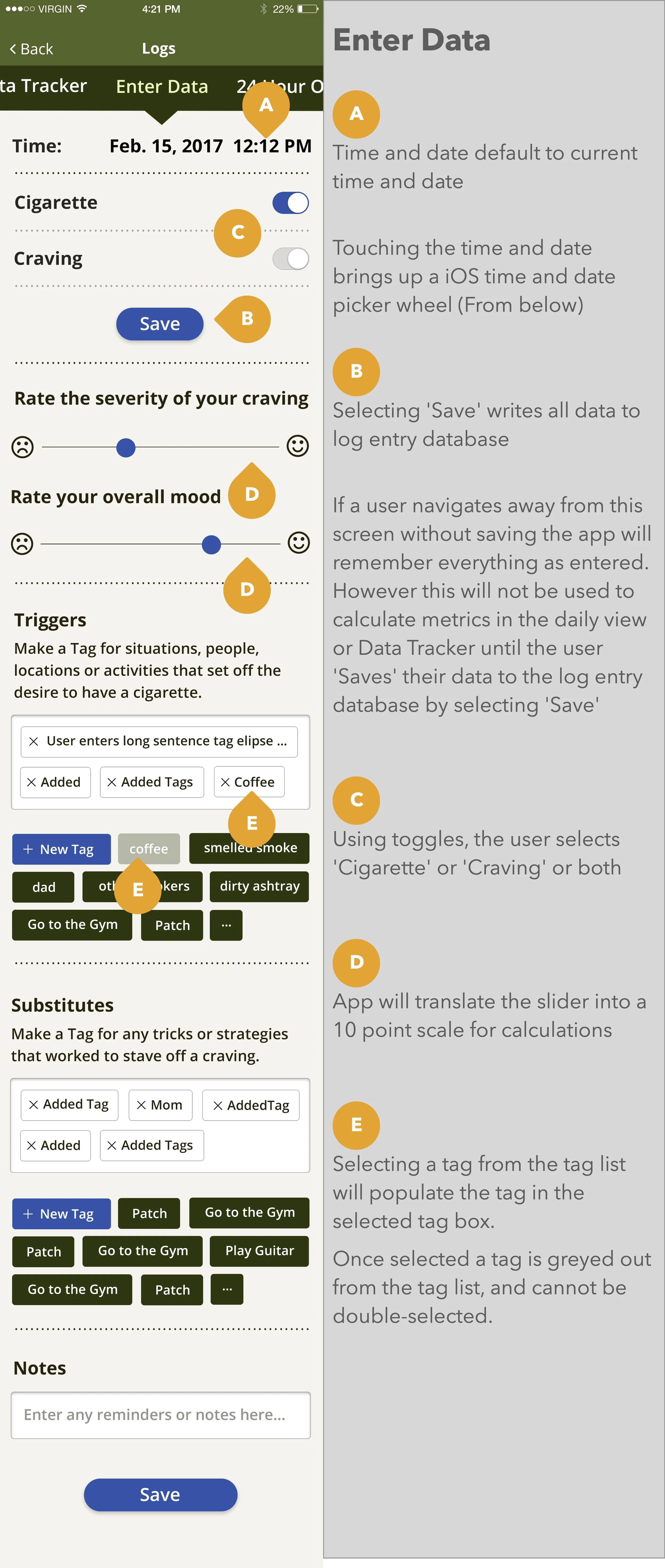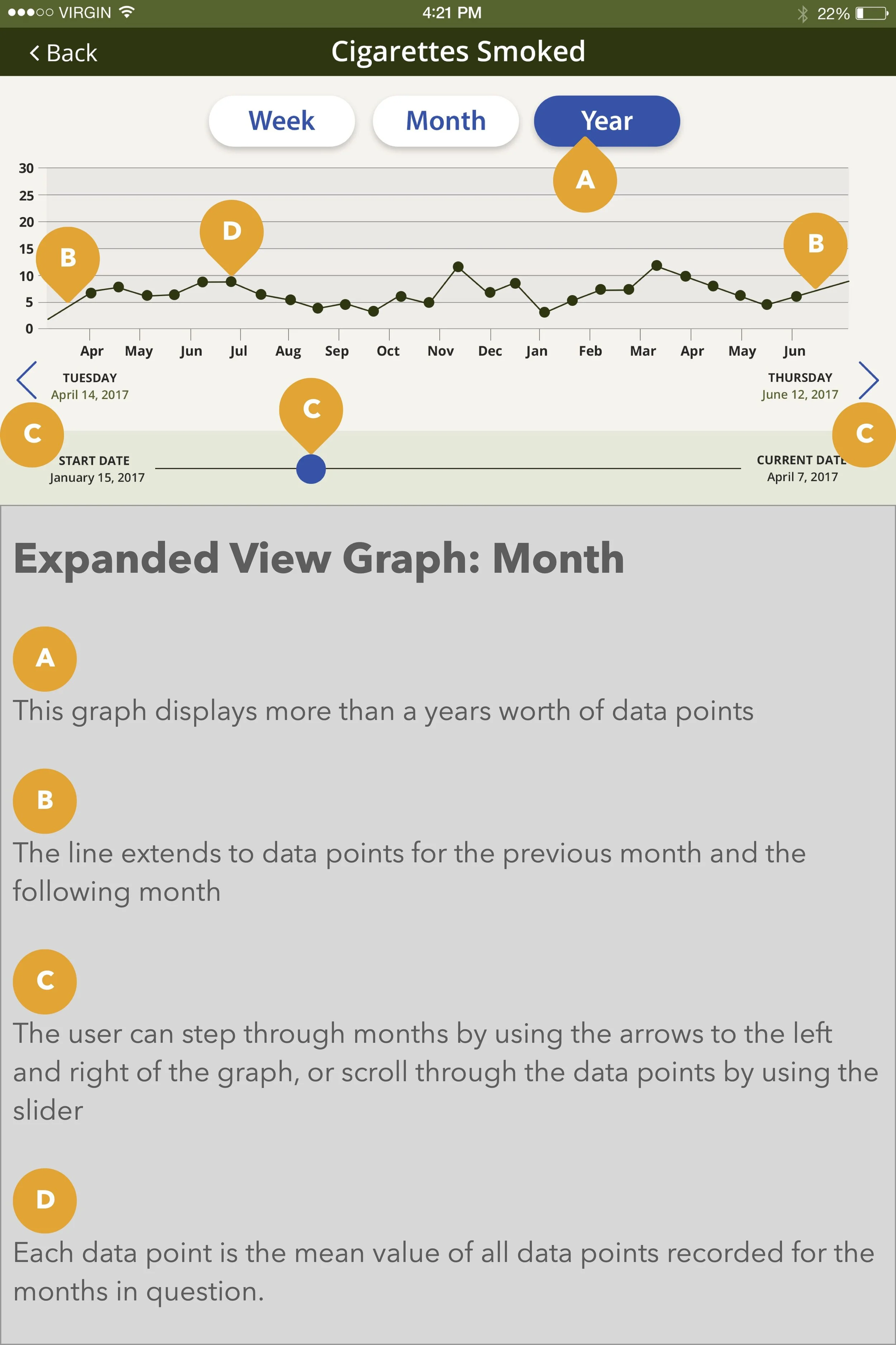 Below are functional specifications with a full visual treatment for the tobacco behavioral tracker as it was designed.