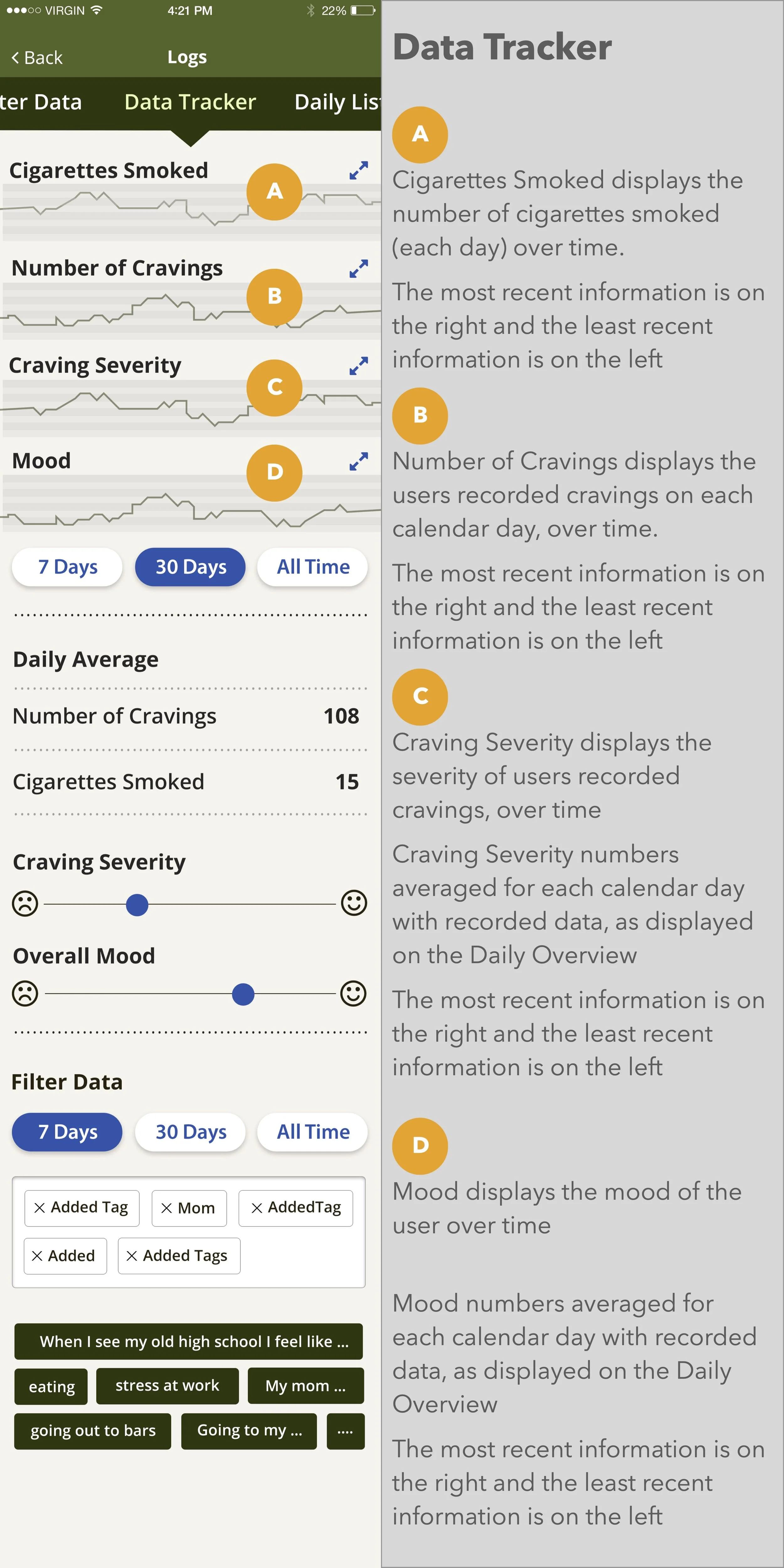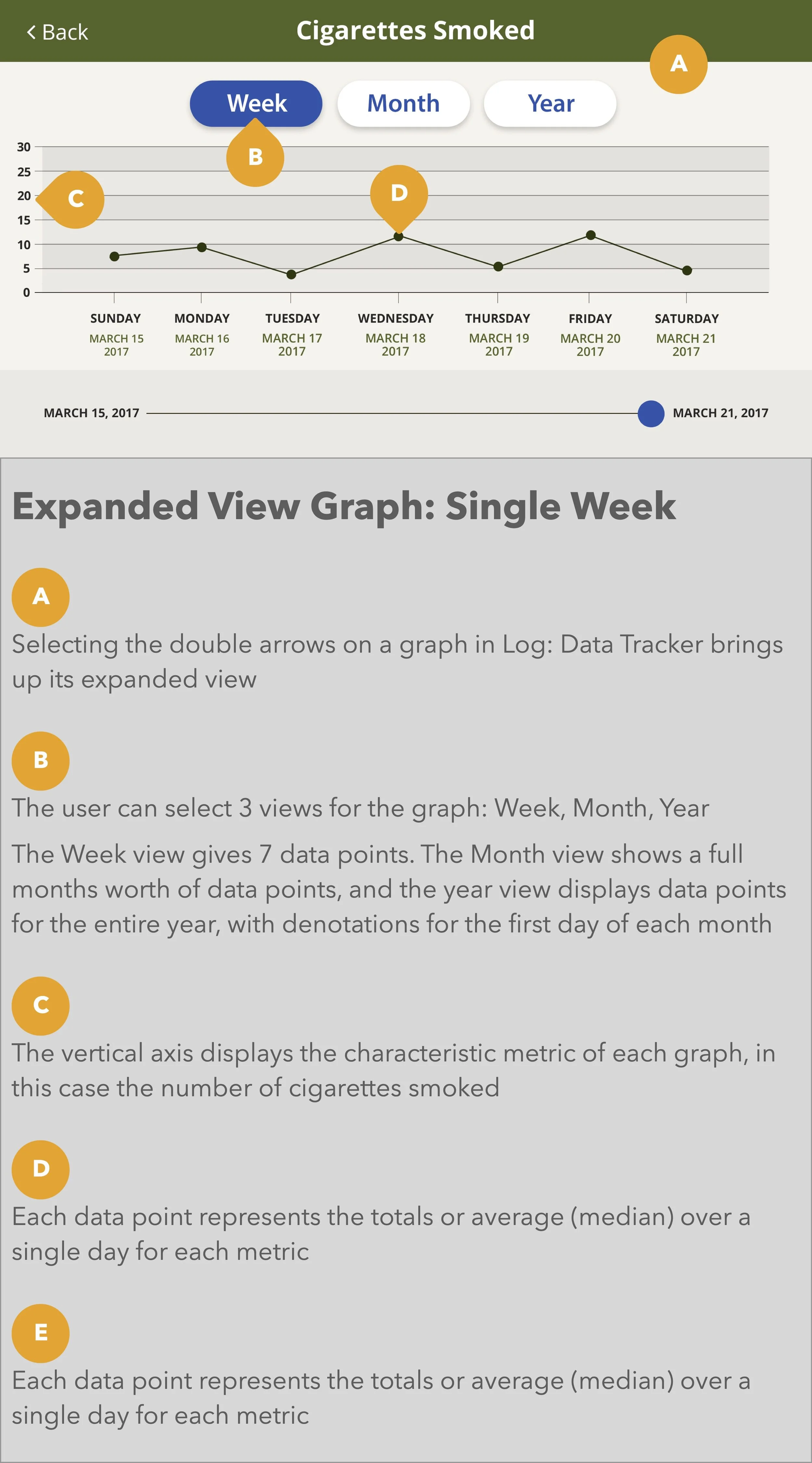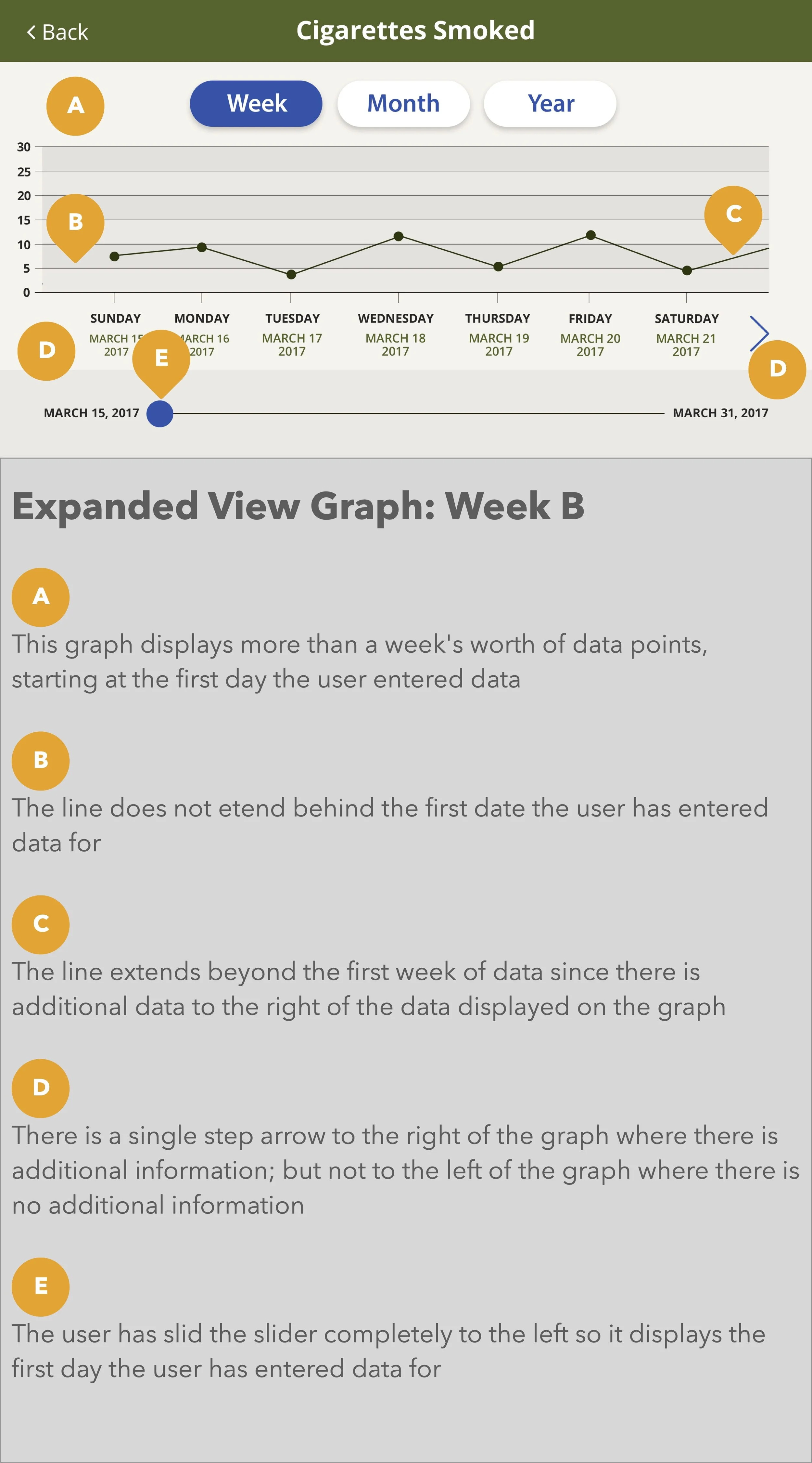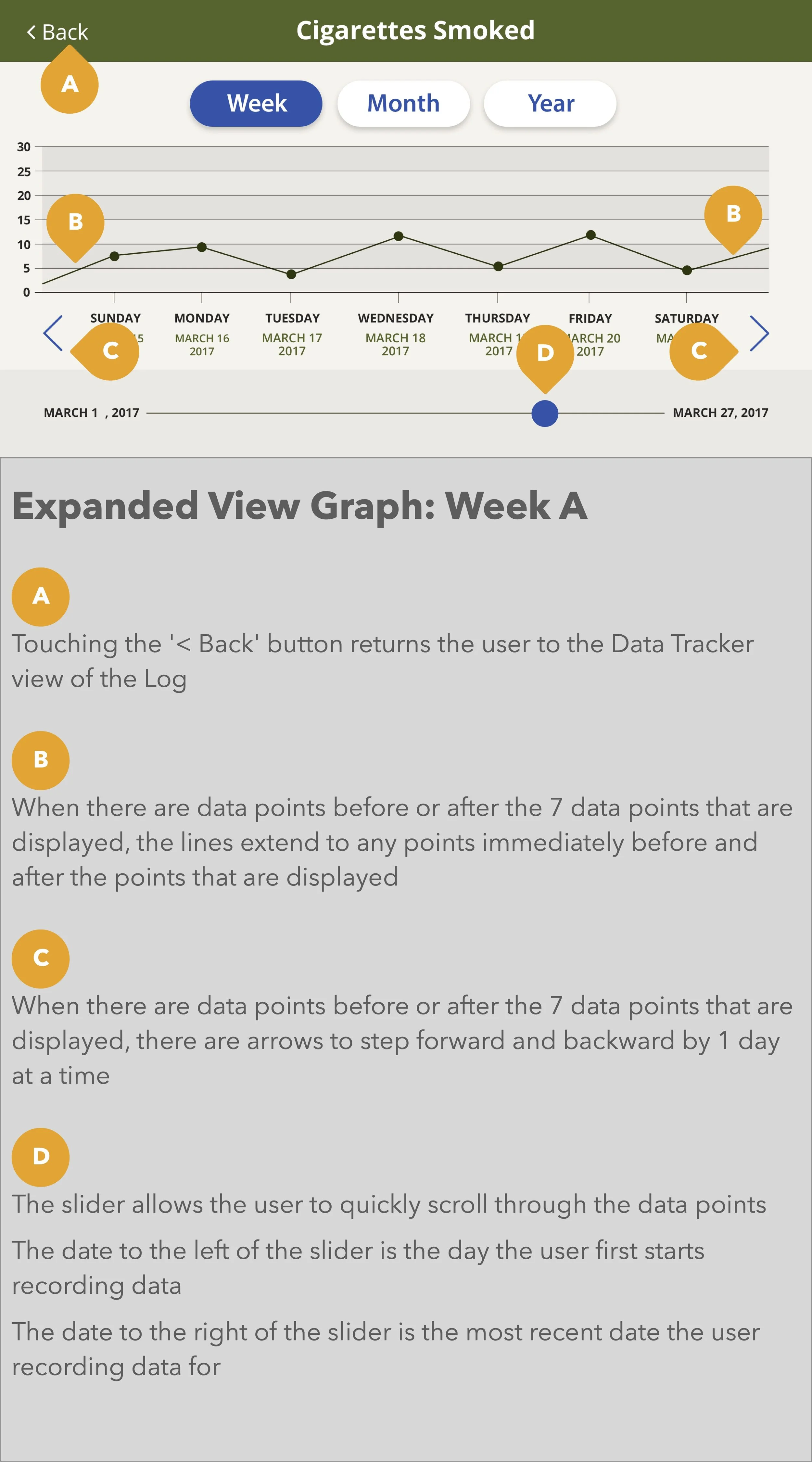 Below are functional specifications with a full visual treatment for the tobacco behavioral tracker as it was designed.