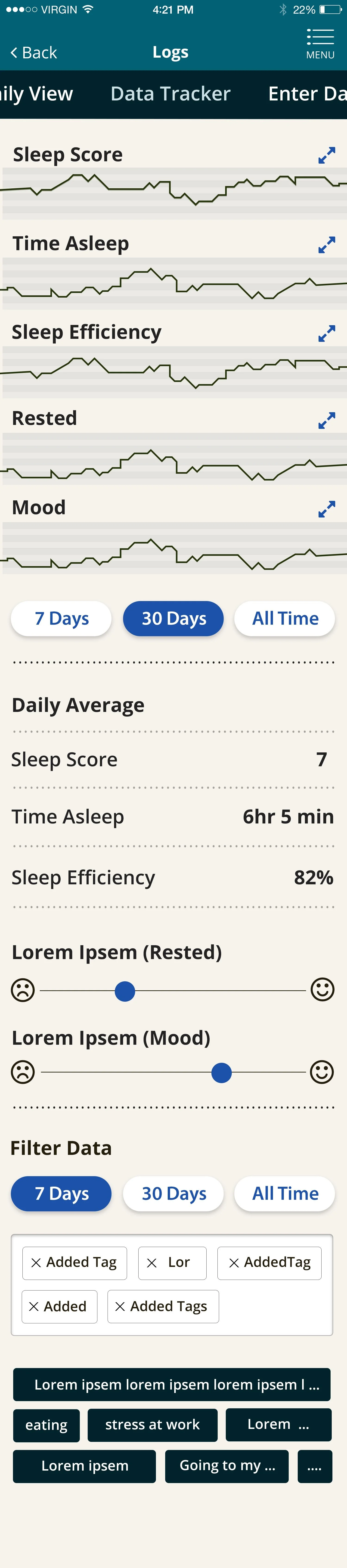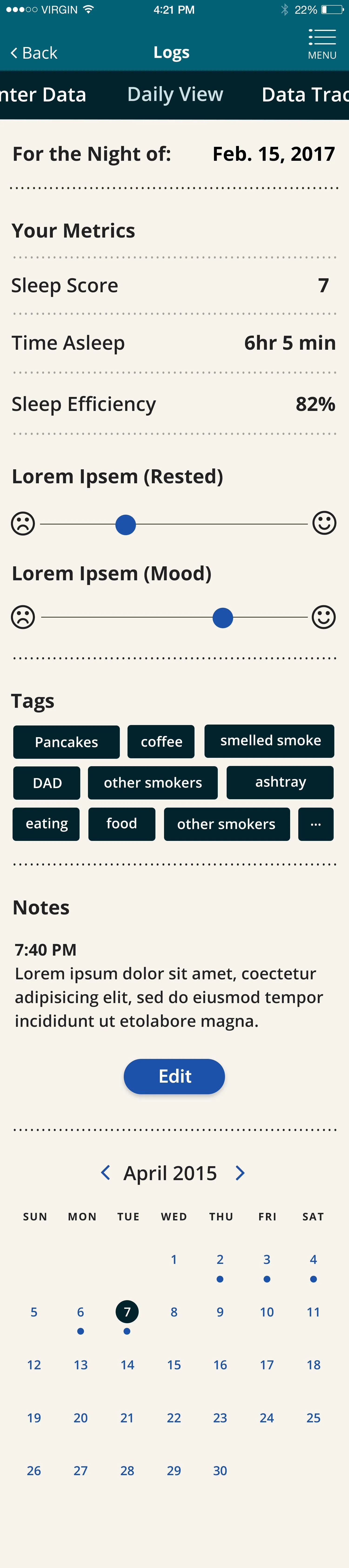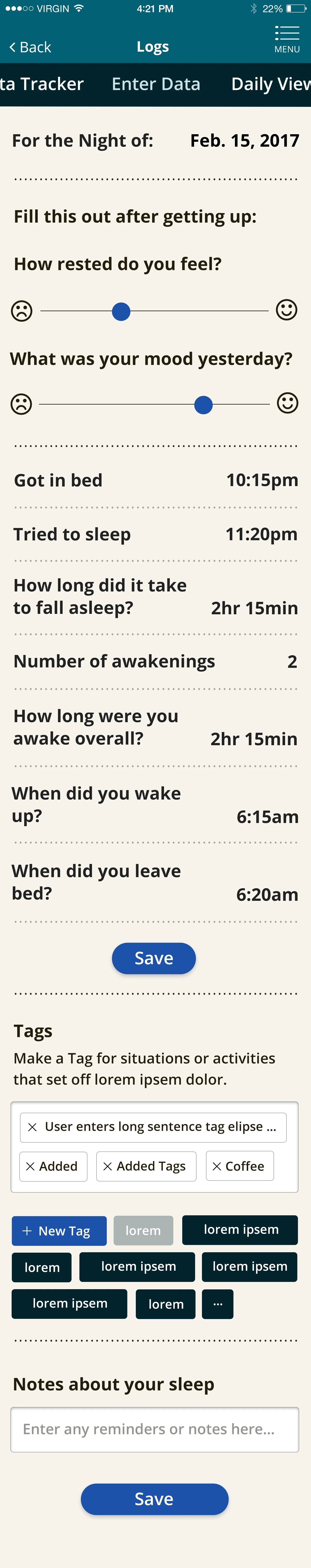 Below are wireframes with a full visual treatment for the insomnia behavioral tracker as it was designed.